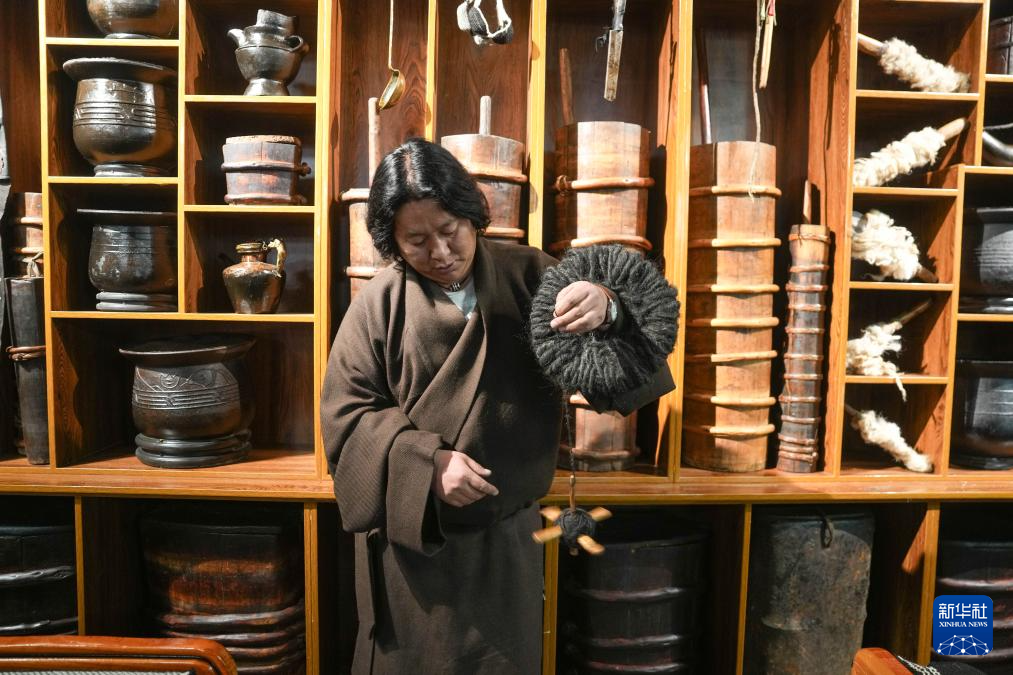 “牧人寶庫(kù)”藏式茶館主人珠珠演示紡羊毛線用的工具(2月13日攝)。新華社記者 晉美多吉 攝