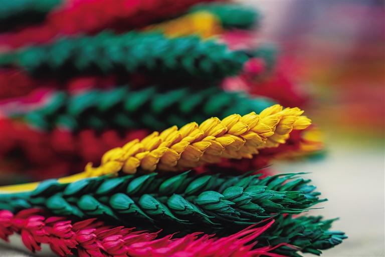 從春耕、夏耘、秋收到冬天的染色、晾干、捆綁、售賣,“羅薩梅朵”的制作過(guò)程并不簡(jiǎn)單,種植和上色都極其辛苦。卓瑪次仁告訴記者:“每年4月,我們開始種植小麥和青稞,澆水施肥。9月收割時(shí),我們會(huì)挑選顆粒飽滿的麥穗和青稞穗,捆綁后去皮曬干。10月,將它們收入屋中,一層層壘起來(lái),房間最好朝陽(yáng)且沒有老鼠。11月,開始采購(gòu)顏料和捆扎用的毛線。”