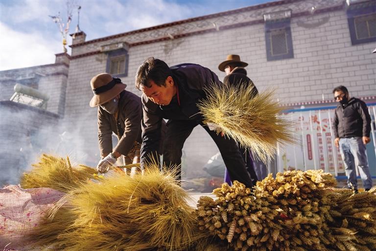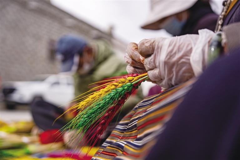 每年12月起,桑木村處處可見“羅薩梅朵”。清晨,天還未亮,村民們就已忙碌起來(lái)。有人將制作好的“羅薩梅朵”打包送往拉薩市區(qū)售賣,有人則繼續(xù)為剩下的麥穗和青稞穗上色、曬干。“我從小看著長(zhǎng)輩們制作‘羅薩梅朵’,7歲就開始幫忙捆綁,20歲開始獨(dú)立制作。每到這個(gè)時(shí)候,我就知道新年快到了。”64歲的村民卓瑪次仁回憶道。