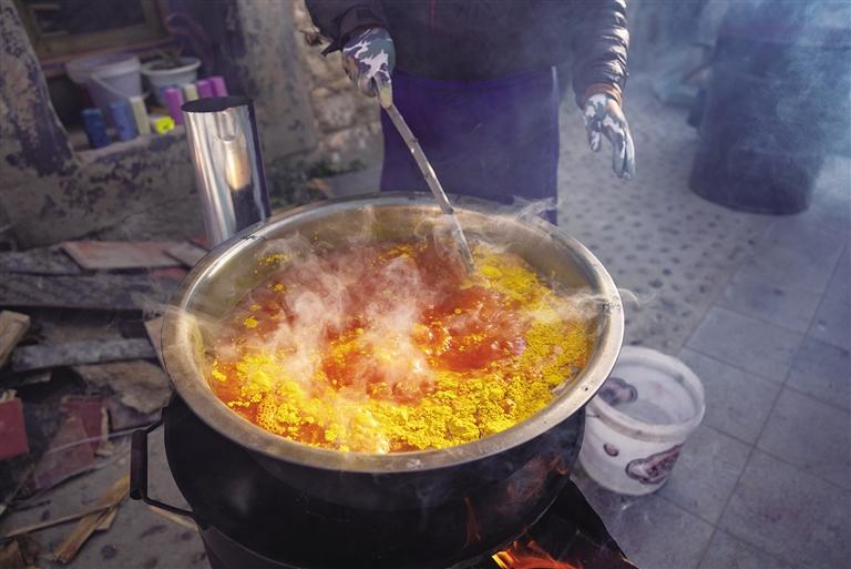 “玫紅色和黃色的都做完了吧?這個(gè)顏料水我倒了,開始準(zhǔn)備制作青色?!币慌?,61歲的央金將盆洗干凈,繼續(xù)煮水放入顏料?!啊_薩梅朵’有青色、綠色、玫紅色、黃色四種顏色,其中青色耗時(shí)最長(zhǎng),不僅需要自己調(diào)制,而且最難上色?!毖虢鹫f(shuō),“我們一般是早上7點(diǎn)開始上色,上完色都快下午4點(diǎn)了?!?/p>