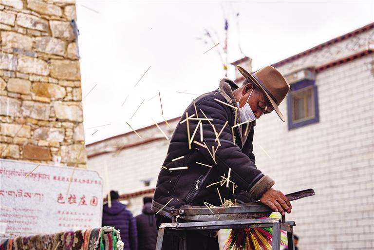 “一個(gè)人一天可以制作300到400捆‘羅薩梅朵’,批發(fā)價(jià)2元一捆,零售價(jià)5元一捆。每年賣完‘羅薩梅朵’后,我們就開始置辦年貨了?!?1歲的央金家共有5口人,“羅薩梅朵”是她家的主要收入來(lái)源。每天早晨7點(diǎn),她家的燈光就已亮起。央金留在家中制作“羅薩梅朵”,丈夫和女兒則前往拉薩市區(qū)售賣。