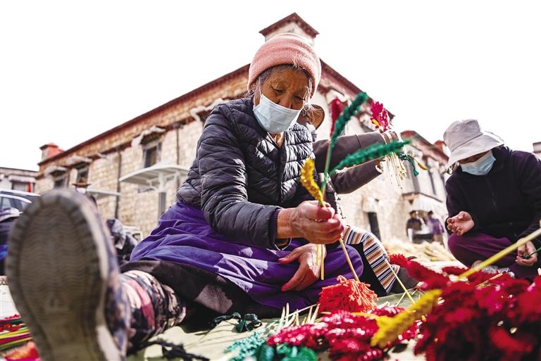 以前,高原植被稀疏,冬日里鮮花更是罕見。人們制作“羅薩梅朵”,讓這一束束“人造的花朵”盛開在冬日的高原上,這體現(xiàn)了西藏群眾對(duì)美好生活的熱愛和追求。正如央金所說(shuō),隨著西藏群眾物質(zhì)生活水平的提高,色彩越來(lái)越鮮艷、品質(zhì)越來(lái)越高的“羅薩梅朵”,正是西藏群眾多姿多彩幸福生活的絕佳體現(xiàn)。