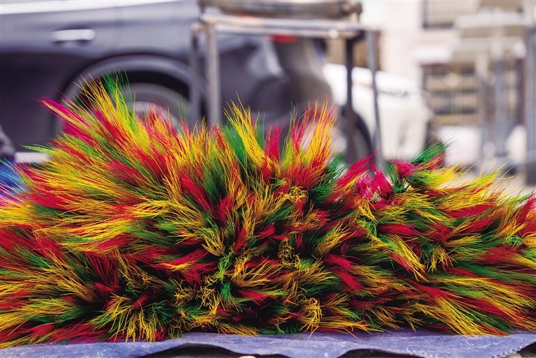 從金黃到色彩斑斕,“羅薩梅朵”的制作需要經(jīng)過(guò)收割、曬干、上色等數(shù)道工序,這是桑木村村民傳承至今的手藝。熱氣騰騰的顏料鍋旁,年輕的媳婦正在煮顏料;曬干的“羅薩梅朵”堆在一旁,一位奶奶和她的孫子正在有序捆綁。廣場(chǎng)上,年齡最大的村民近70歲,最小的12歲,年輕人從老一輩手中接過(guò)了文化傳承的接力棒。