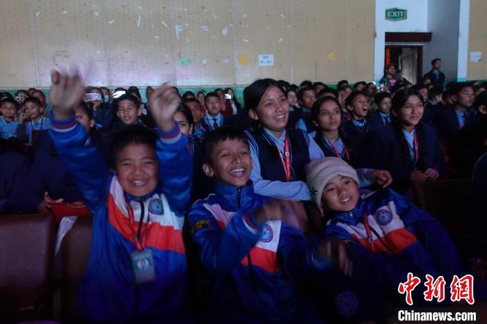 2月20日,中尼跨國新春文藝晚會在尼泊爾博克拉舉行,尼泊爾學(xué)生在聽到博克拉國際機(jī)場開通首條定期國際航線時歡呼雀躍?!≈行律缬浾?崔楠 攝