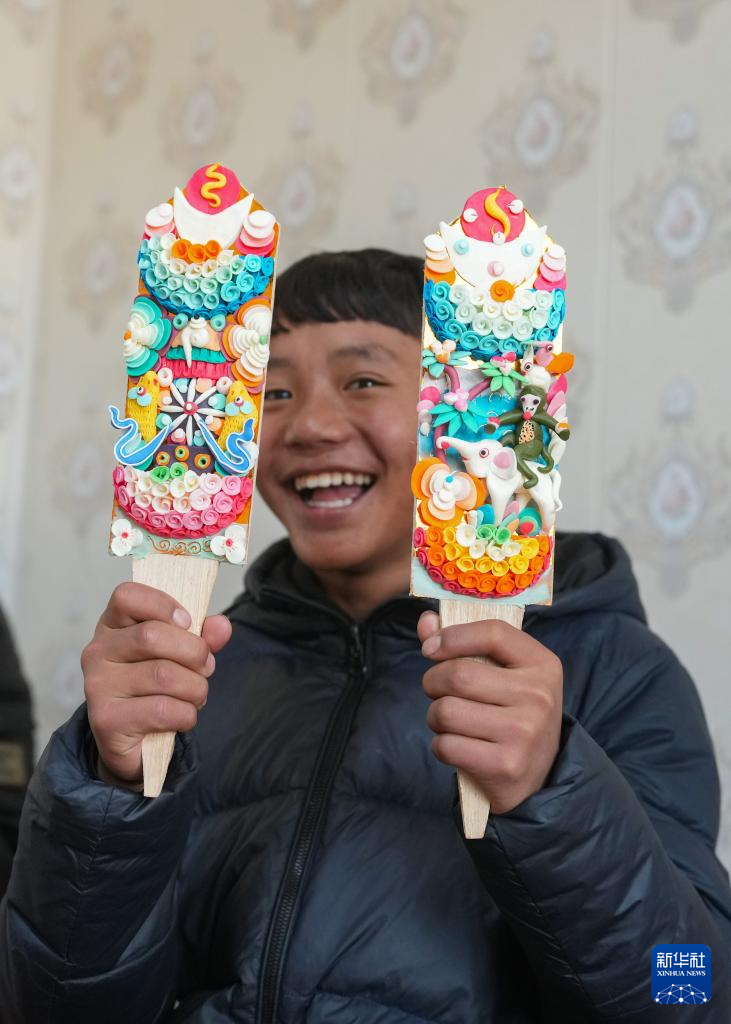 在拉薩市老城區(qū),小學徒在展示剛剛做好的一對酥油花(2月25日攝)。新華社記者 晉美多吉 攝