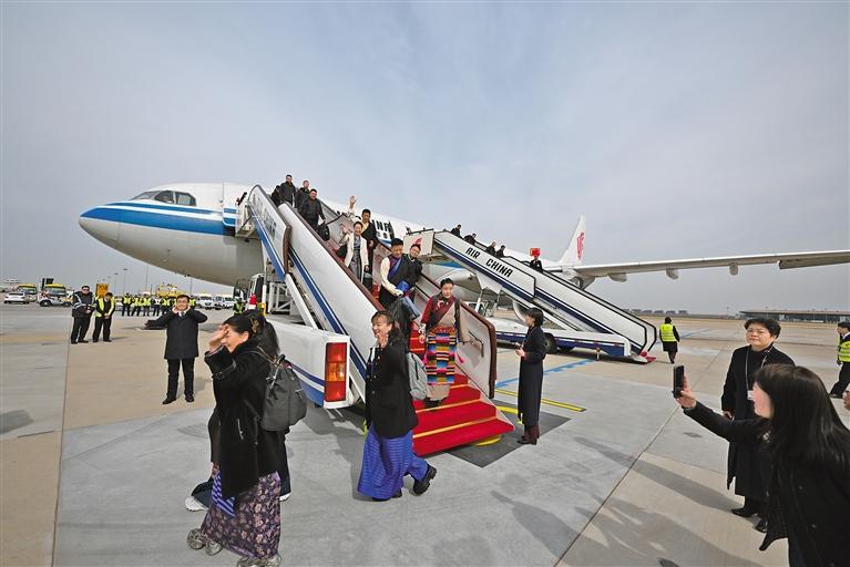 圖為西藏參加全國(guó)兩會(huì)的代表委員乘機(jī)抵達(dá)北京。記者 旦增西旦 攝