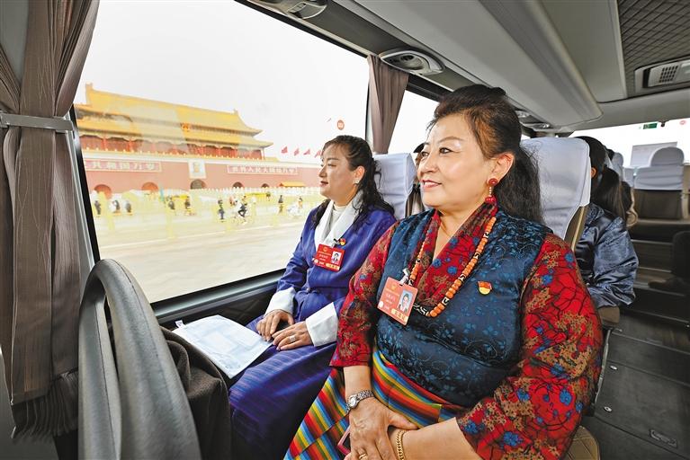 圖為人大代表們乘車前往駐地的途中經(jīng)過(guò)天安門廣場(chǎng)。記者 旦增西旦 攝