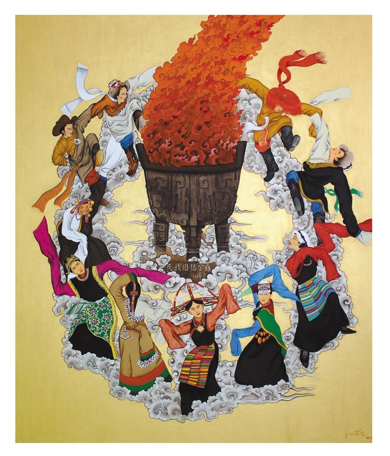 2012年到2019年,在西藏推進(jìn)“西藏百幅新唐卡工程”中,這種扎根生活的創(chuàng)作理念得到充分展現(xiàn)。他與200多位畫師共同創(chuàng)作的《青藏公路通車》《西藏和平解放》等作品,將重大歷史事件與藏族民間敘事巧妙結(jié)合,既展現(xiàn)了時(shí)代變遷,又保留了民族藝術(shù)特色。這種“唯美唯新唯唐”的創(chuàng)作追求,為西藏主題性繪畫開辟了新路徑。