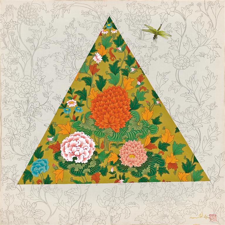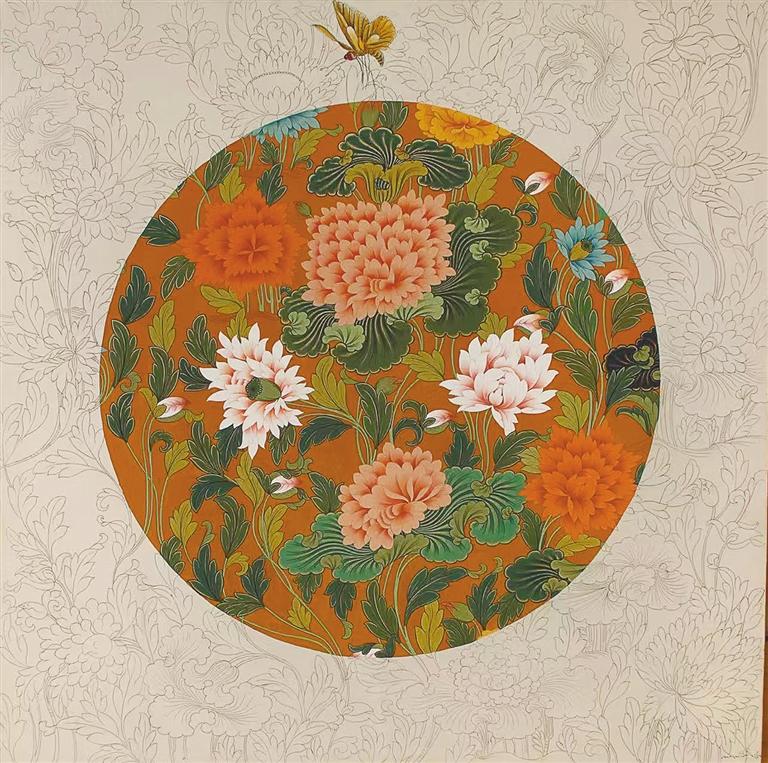 “我喜歡把傳統(tǒng)的壁畫、唐卡里的花卉等元素表現(xiàn)在作品中,其次將這些元素進(jìn)行當(dāng)代轉(zhuǎn)譯,通過布面重彩的形式重構(gòu)敘事,最后注入對(duì)西藏現(xiàn)代化進(jìn)程的深度觀照?!崩痛稳收f,“這種創(chuàng)新不是簡(jiǎn)單的符號(hào)拼貼,而是要在吃透?jìng)鹘y(tǒng)技藝精髓的基礎(chǔ)上,像青稞扎根土壤般從西藏本土文化中生長(zhǎng)出當(dāng)代藝術(shù)語言?!?/p>