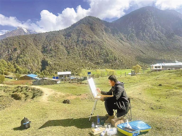 拉巴次仁在千年古鎮(zhèn)吉隆溝扎村寫生。