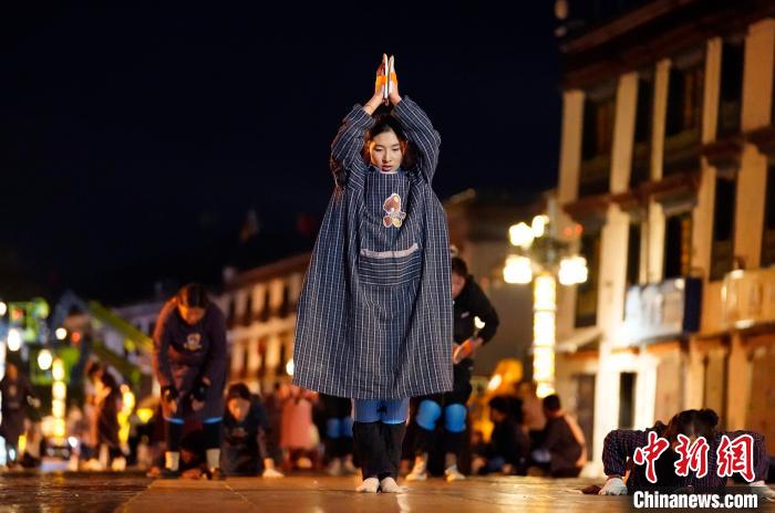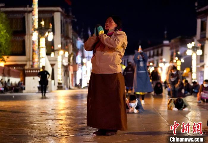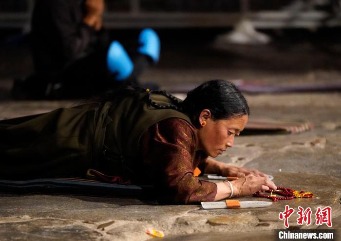圖為當日凌晨,信眾在拉薩大昭寺前磕長頭。中新社記者 李林 攝