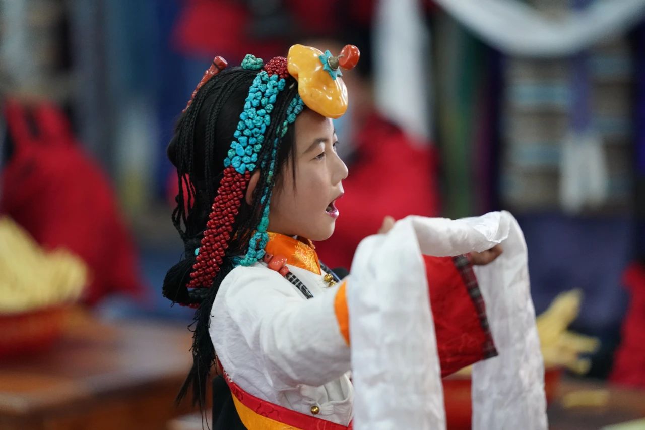 2020年10月14日,青海省雜多縣第二民族完全小學的小學生表演《格薩(斯)爾》史詩說唱藝術(shù)。中新社記者 蘇丹 攝