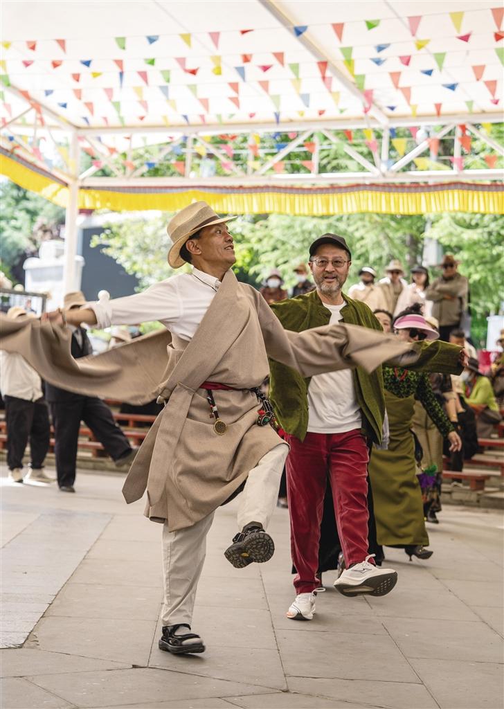 踢踏聲中,老人們甩掉了腰酸腿痛,年輕人驅(qū)散了工作疲憊。鮮艷的藏裝旋出歡樂弧線,嘹亮的歌謠唱出心底喜悅。藏裝翻飛如彩蝶,歌聲清亮繞湖岸,每一個旋轉(zhuǎn)都盛滿笑意。
