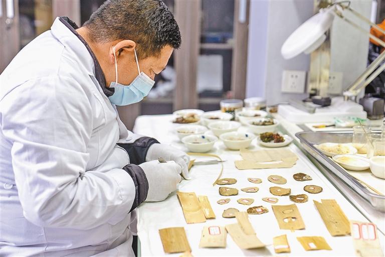 圖為布達拉宮貝葉經(jīng)實驗性修復(fù)小組實驗室工作人員對貝葉進行處理。 新華社記者 旦增尼瑪曲珠 攝