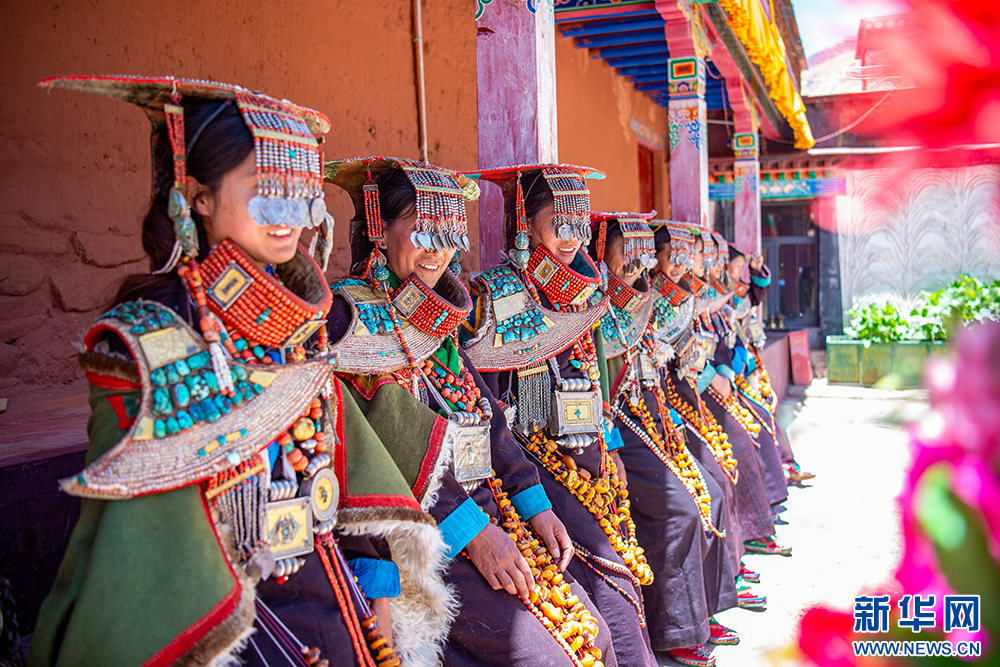 身著“普蘭服飾”的普蘭縣科迦村村民(6月10日攝)?!捌仗m服飾”,主要由袍子、披風(fēng)、頭飾、項鏈、腰帶、耳墜、靴子組成。其中最精美、最獨特的為婦女服飾,外形設(shè)計如同孔雀開屏,被譽為“孔雀”服飾,一套重達20多公斤,裝飾有黃金、白銀、蜜蠟、珊瑚、綠松石等。新華網(wǎng) 旦增努布 攝