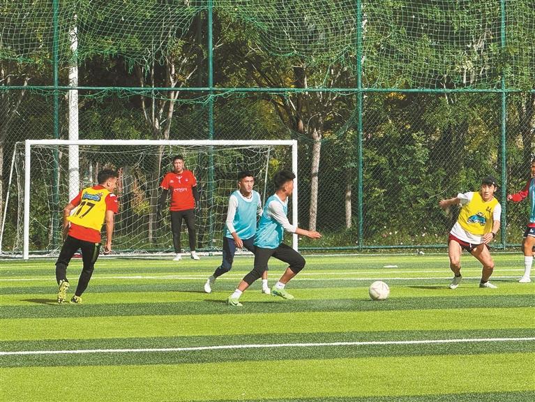圖為拉薩濱河體育公園內,足球愛好者們正在比賽。記者 馮琳琳 曹琳 攝