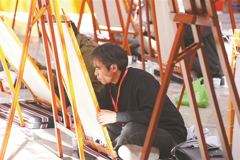 圖為唐卡畫師創(chuàng)作現(xiàn)場。記者 扎西頓珠 攝