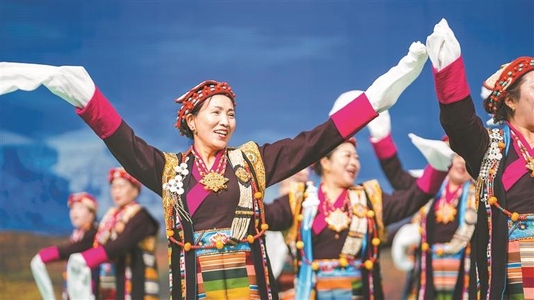 圖為拉薩市堆龍德慶區(qū),身著民族特色服飾的中老年演職人員載歌載舞歡慶佳節(jié)。記者 歐珠次仁 攝