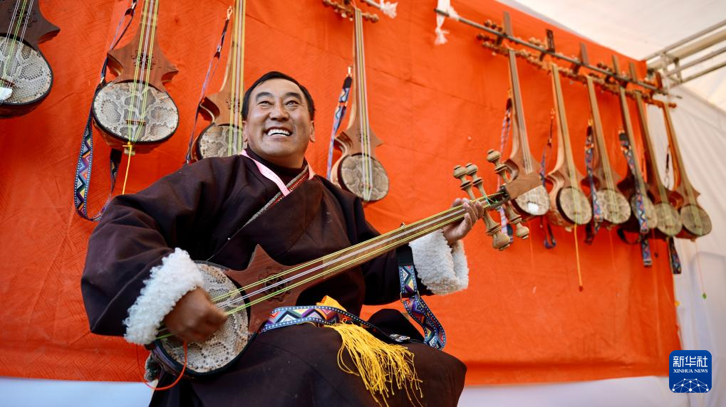 來(lái)自曲松縣朱麥沙村的洛桑曲扎,在攤位前彈起自己手工制作的扎念琴,悅耳的琴聲吸引人們紛紛停下腳步。
