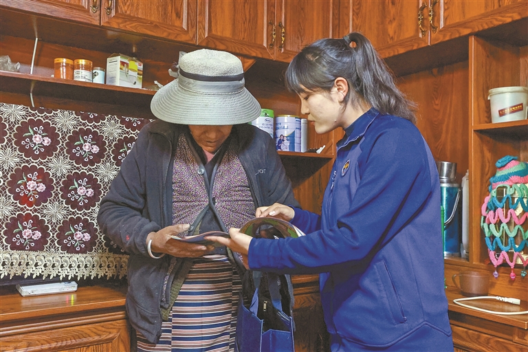 圖為崗拉美朵女子雙語(yǔ)志愿服務(wù)隊(duì)開展“敲門入戶”行動(dòng)。記者 王香香 見習(xí)記者 土旦仁青 攝