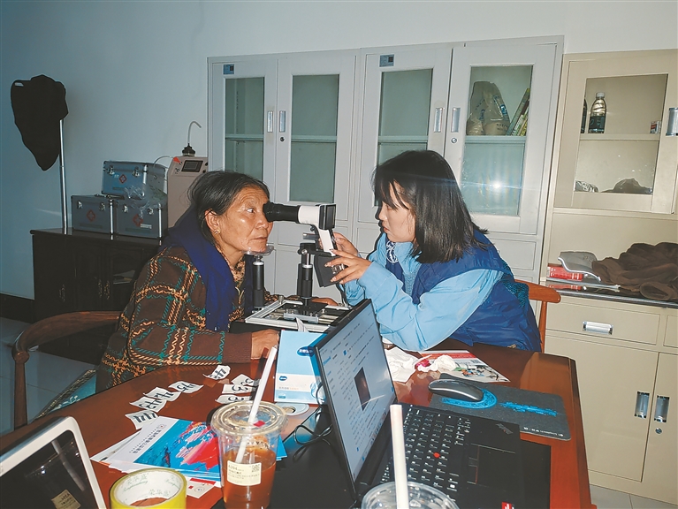 圖為西藏星光社會(huì)工作服務(wù)中心工作人員在堆龍德慶區(qū)東嘎街道祥和苑社區(qū)運(yùn)用AI篩查設(shè)備,為轄區(qū)搬遷群眾開(kāi)展眼病篩查。記者 格桑倫珠 攝