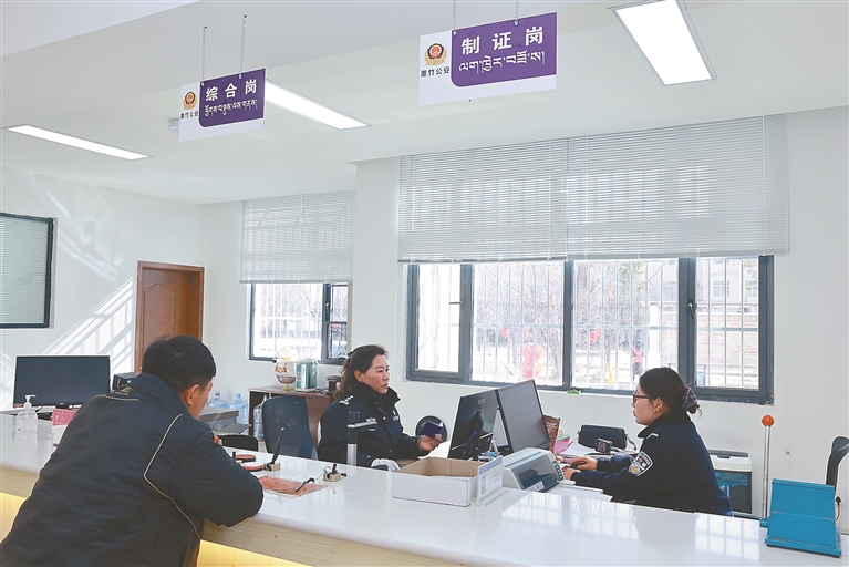 圖為墨竹工卡縣公安局交警大隊(duì)服務(wù)大廳內(nèi),民警在為市民辦理業(yè)務(wù)。