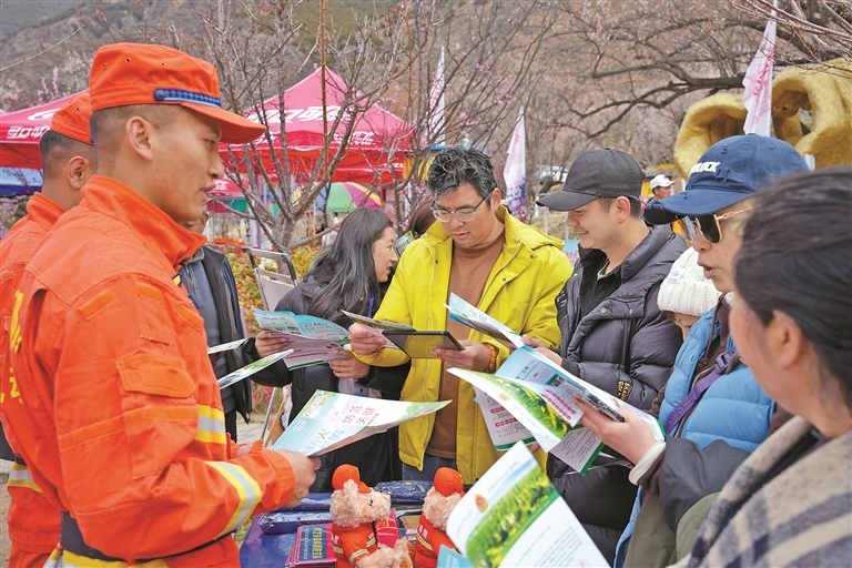 春和景明,桃花漸次綻放,各地游客紛至沓來(lái),景區(qū)用火風(fēng)險(xiǎn)也同步攀升。為了切實(shí)筑牢防火安全防線,近日,林芝消防救援機(jī)動(dòng)支隊(duì)巴宜大隊(duì)深入巴宜區(qū)林芝鎮(zhèn)嘎拉村,在游客集散點(diǎn)、桃花林核心區(qū)域設(shè)立定點(diǎn)防火宣傳點(diǎn),通過(guò)漢藏雙語(yǔ)展板、宣傳手冊(cè)和現(xiàn)場(chǎng)講解,向游客普及森林防火知識(shí)與應(yīng)急避險(xiǎn)技能。同時(shí),組建流動(dòng)宣傳小隊(duì),利用廣播宣講、沿街提醒等方式,將消防安全知識(shí)延伸至游客步道、商戶,確保宣傳無(wú)死角、全覆蓋。此外,執(zhí)勤人員攜帶風(fēng)力滅火機(jī)、組合工具等專業(yè)裝備,沿著陡峭的步道和林區(qū)小徑展開(kāi)拉網(wǎng)式巡查,確保遇有突發(fā)情況能夠快速響應(yīng)、高效處置。