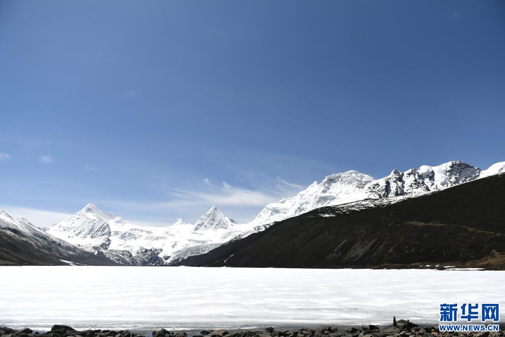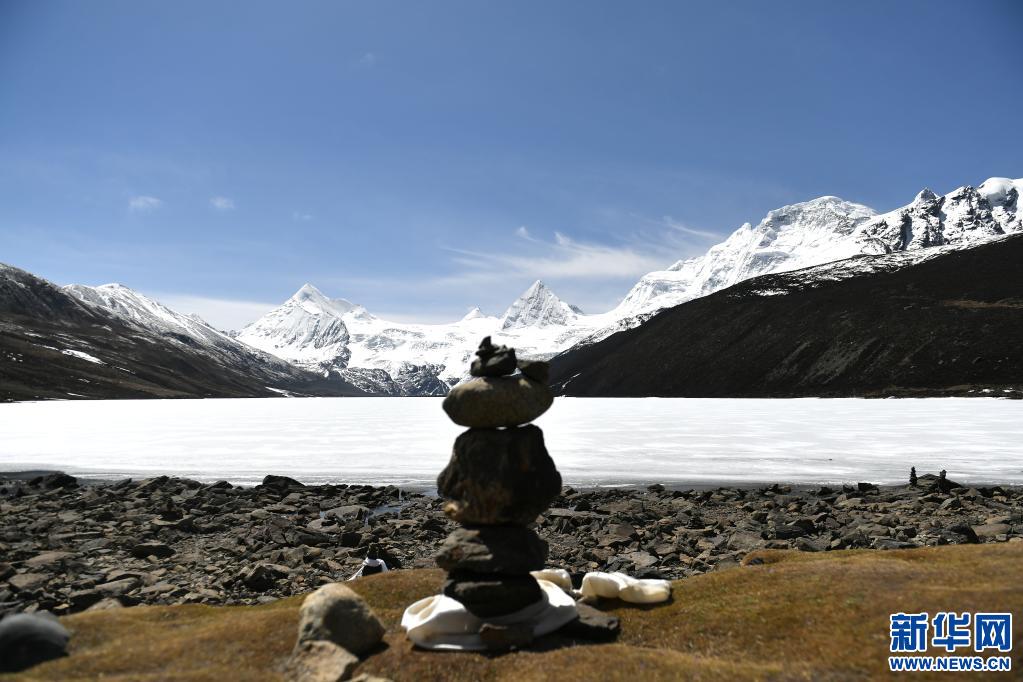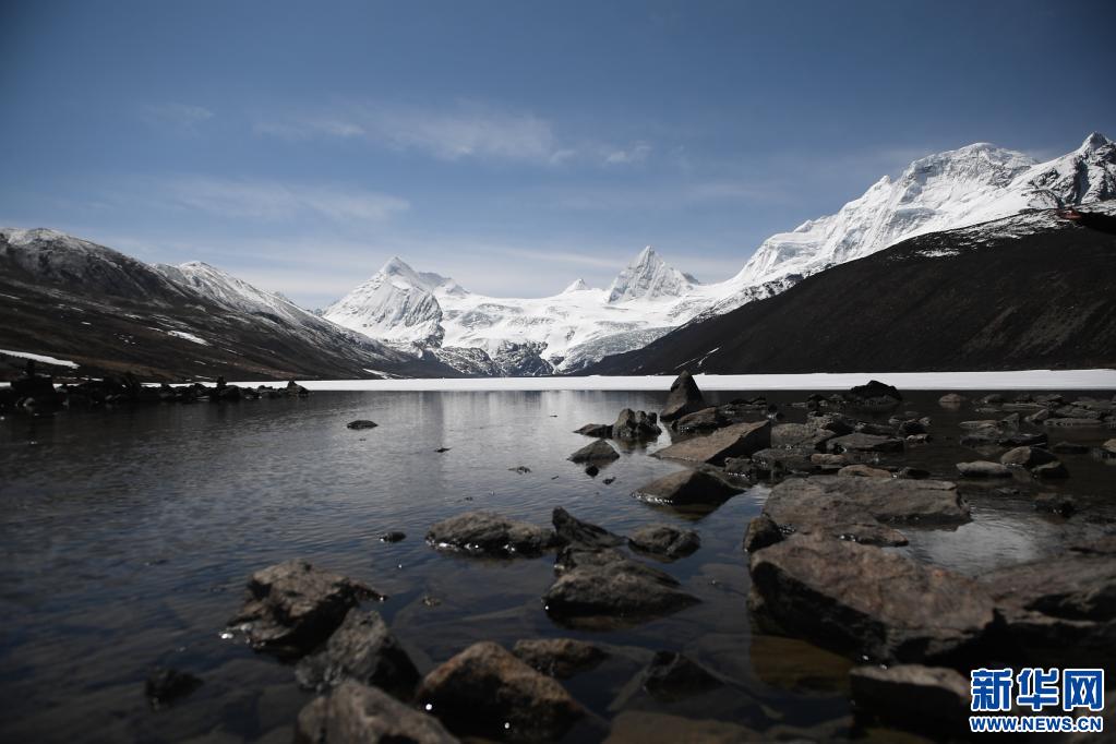 這是5月4日拍攝的薩普雪山和雪山腳下的冰湖(無人機(jī)照片)。新華社記者 孫瑞博 攝