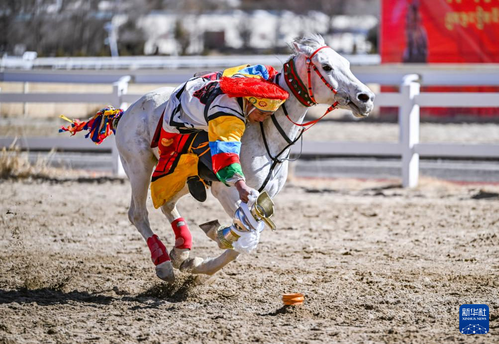 在拉薩賽馬場,騎手表演馬上拾哈達(2月12日攝)。新華社記者 孫非 攝