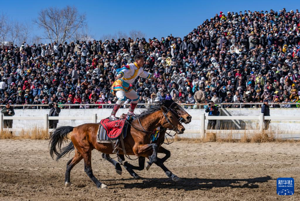 在拉薩賽馬場,騎手進行雙馬單人表演(2月12日攝)。新華社記者 孫瑞博 攝