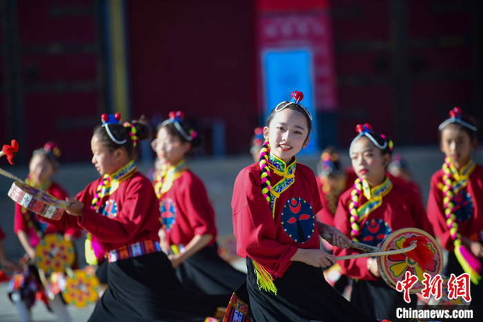 資料圖為西藏自治區(qū)拉薩市城關(guān)區(qū)慈覺林數(shù)十名孩子練習(xí)熱巴舞。 中新社記者 貢嘎來松 攝
