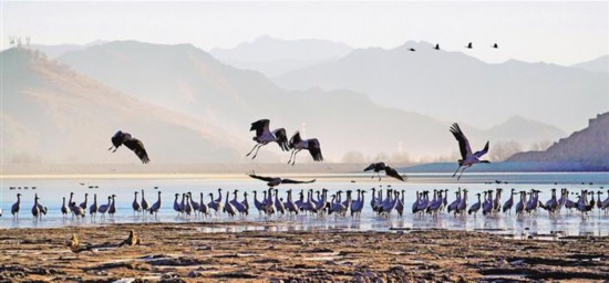 圖為在林周縣保護(hù)區(qū)內(nèi)自由飛翔的黑頸鶴。 央金 攝