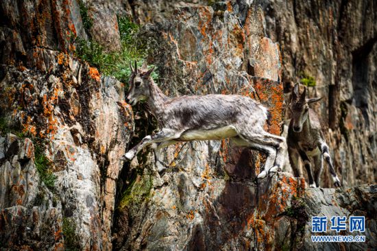 兩只巖羊在巖壁上跳躍。新華網(wǎng) 宋忠勇 攝