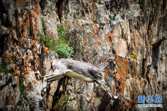 一只巖羊在巖壁上跳躍。新華網(wǎng) 宋忠勇 攝