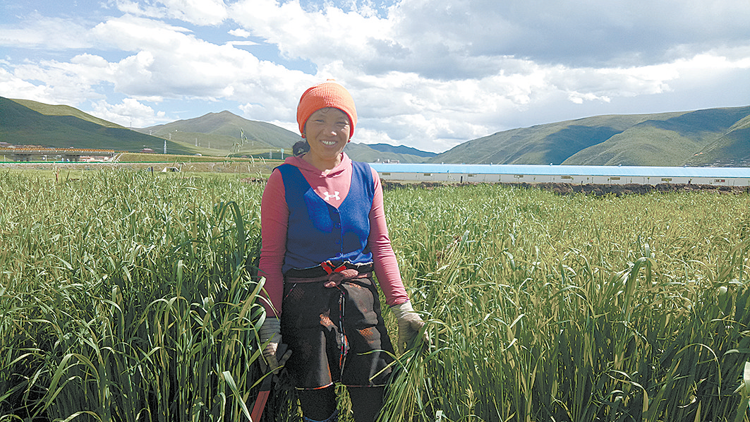 澤白是門堂鄉(xiāng)門堂村的貧困戶,家里有四口人,這些年,得益于草原補(bǔ)助、生態(tài)管護(hù)員等脫貧政策,澤白家于2016年脫貧。禁牧實(shí)施以來(lái),澤白和丈夫種植了0.3公頃(五畝)草地早熟禾,當(dāng)記者見(jiàn)到澤白時(shí),她正在一片綠油油的田地間“揮舞”著鐮刀,身邊已有好幾摞割好的早熟禾。