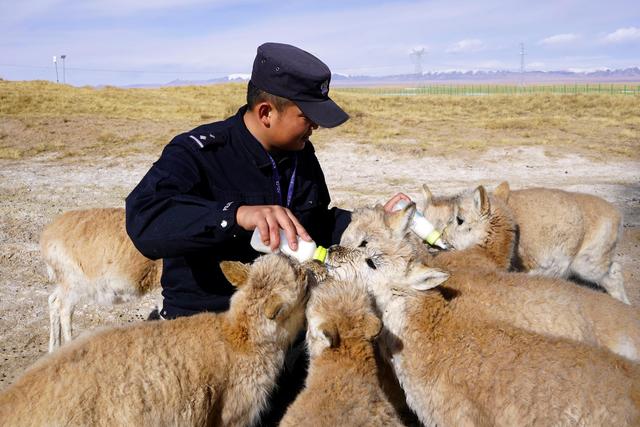 12月7日,在給藏羚羊幼仔喂奶前,可可西里索南達杰保護站站長趙新錄(中)用嘴測試奶溫。