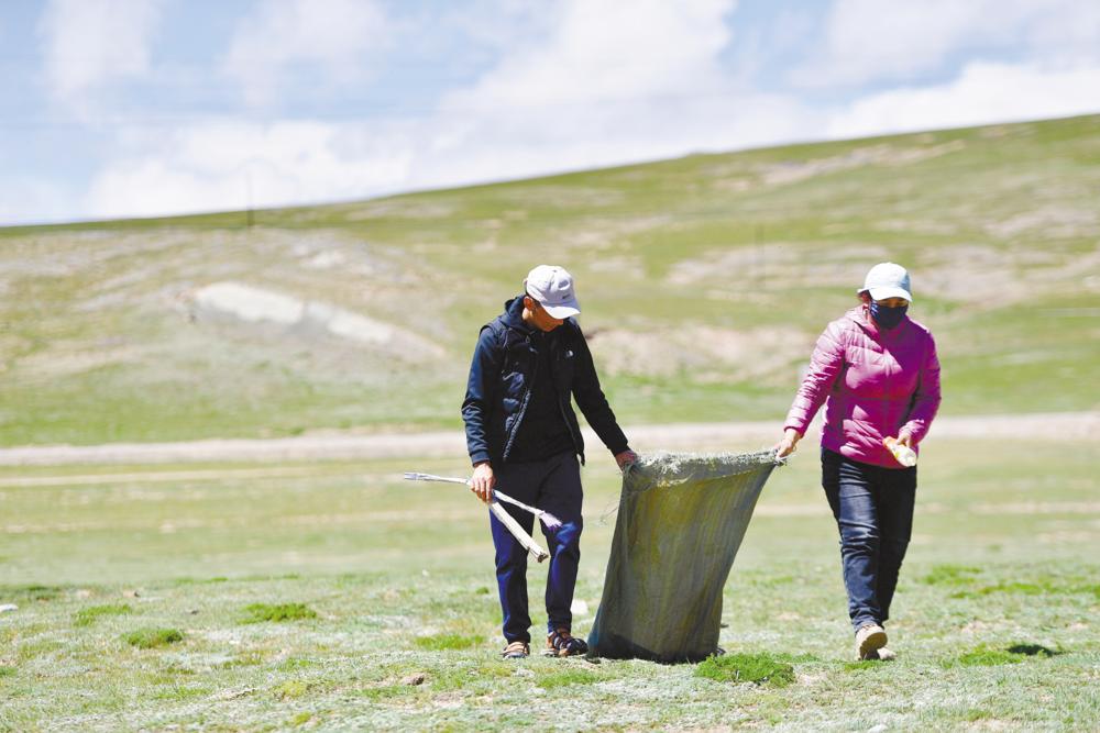 瑪多縣瑪查理鎮(zhèn)噶丹村,生態(tài)管護員索南吉(右)與才讓多杰在村子周邊的草原上撿垃圾。
