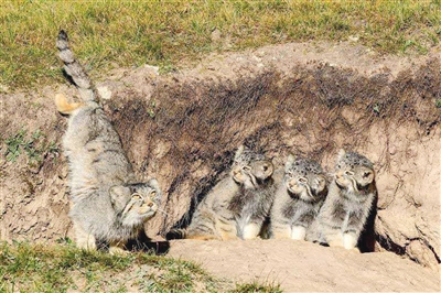 早上8時(shí)左右,暖洋洋的太陽(yáng)灑在山坡上,這時(shí)五六十米外的洞穴中有了動(dòng)靜,只見(jiàn)一種有著黃色眼睛和寬短耳朵,形似家貓的動(dòng)物探頭探腦地出來(lái)了,原來(lái)是一只兔猻媽媽帶著三只小兔猻出來(lái)覓食。