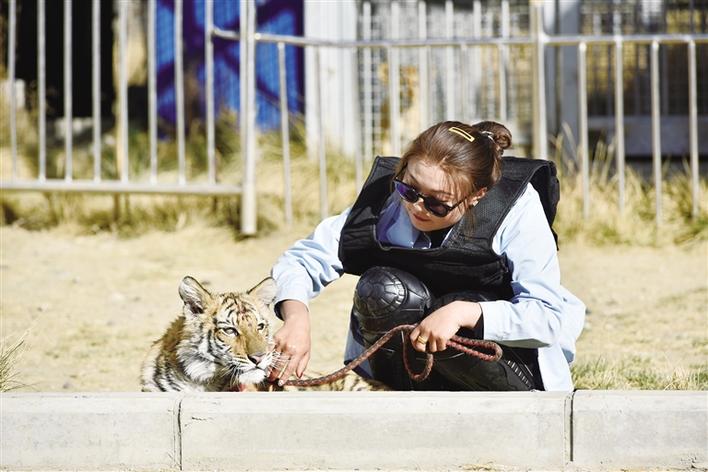 當(dāng)記者看到四只幼獅時,它們時而聚在一起,時而沿著籠子邊溜達,時而張開大嘴向著外人示威,還有一個非?;钴S的在攀爬籠子。小老虎次仁卓瑪雖然沒有兄弟姐妹的陪伴,不過園區(qū)的獸醫(yī)小姐姐成了它最貼心的玩伴。每天,獸醫(yī)小姐姐都會帶著次仁卓瑪進行戶外活動,次仁卓瑪像小朋友一樣喜歡玩皮球,喜歡追著獸醫(yī)小姐姐跑,還特別喜歡獸醫(yī)小姐姐給它按摩,經(jīng)常會撒嬌求抱抱。