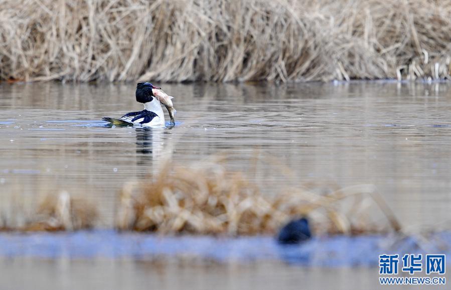 中華秋沙鴨在拉魯濕地的水面上捕魚(yú)(3月7日攝)。新華社記者 張汝鋒 攝