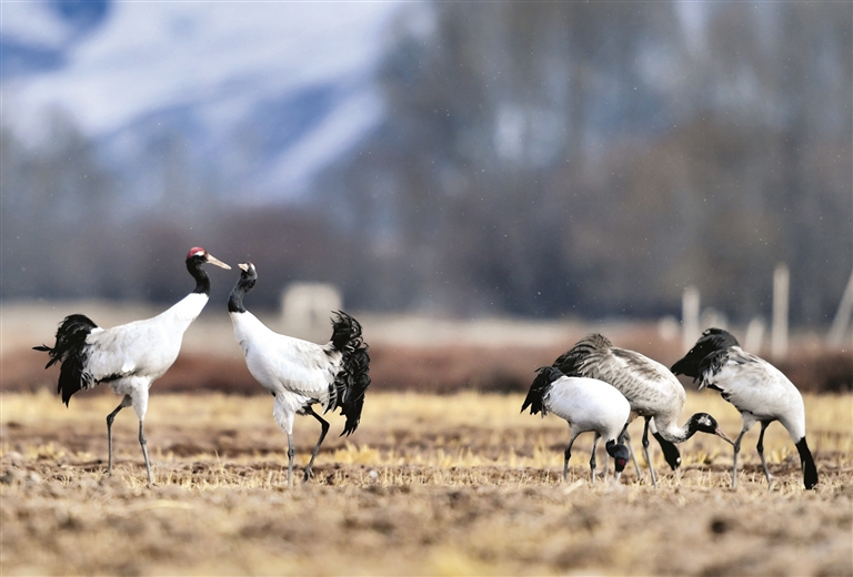 圖為在西藏林周縣黑頸鶴自然保護(hù)區(qū)里棲息覓食的黑頸鶴。 新華社記者 張汝鋒攝