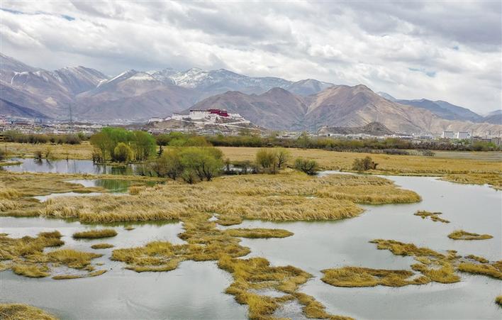 從拉薩市當(dāng)熱西路上向北望去,便能看到這塊北面靠山,東、南、西三面為市區(qū)包圍,面積12.2平方公里的濕地。遠(yuǎn)處,連綿起伏的山頂還覆蓋著薄薄的積雪,布達(dá)拉宮雄偉而秀美;近處,濕地內(nèi)隨意顯現(xiàn)出的一塊塊水泊,成群的候鳥在水中玩耍嬉戲、在藍(lán)天白云下飛舞。拾階過橋,一條木質(zhì)長廊向濕地中延伸,只是我們這些不速之客的到來,驚起水鳥無數(shù)。它們仿佛商量好似的沖上藍(lán)天,讓人為打擾它們的棲息而不安。