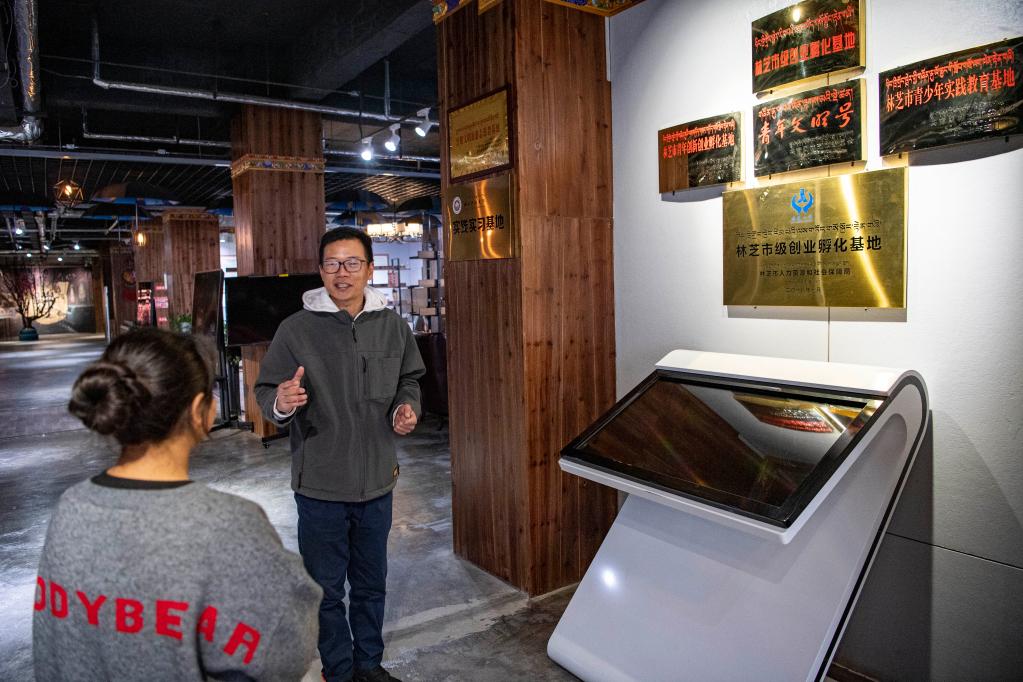 在林芝逐夢眾創(chuàng)產(chǎn)業(yè)園,陸錦華正在向?qū)嵙暽榻B情況(4月2日攝)。新華社記者 孫非 攝