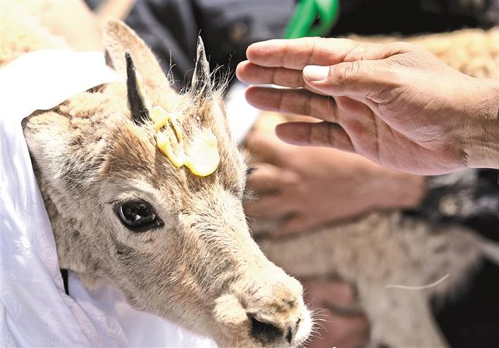 7月7日,在可可西里索南達(dá)杰保護(hù)站野生動物救助中心,三公兩母共五只人工救助的藏羚羊被放歸大自然。圖為7月7日,在可可西里索南達(dá)杰保護(hù)站野生動物救助中心,可可西里巡山隊員按照風(fēng)俗,在藏羚羊額頭上涂抹酥油表達(dá)祝福。[詳細(xì)]