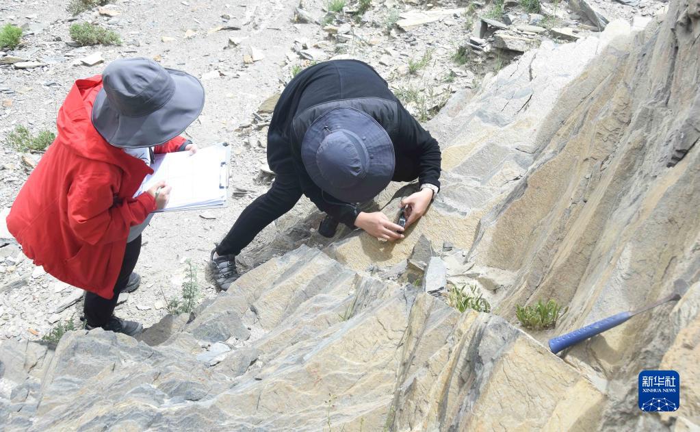 8月22日,在西藏日喀則市亞?wèn)|縣一處山體,科考隊(duì)員使用羅盤,確定巖石的產(chǎn)出狀態(tài)和方位。新華社記者 杜剛 攝
