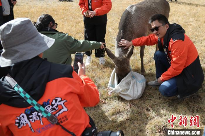圖為西藏類烏齊馬鹿國(guó)家級(jí)自然保護(hù)區(qū)的管護(hù)員正在飼喂馬鹿。 冉文娟 攝
