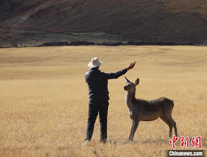 圖為西藏類烏齊馬鹿國(guó)家級(jí)自然保護(hù)區(qū)的管護(hù)員正在飼喂馬鹿?!∪轿木?攝