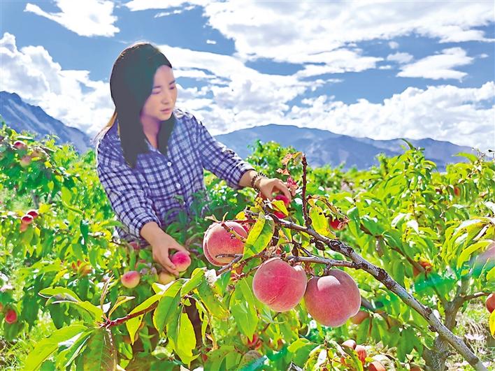 還未走進(jìn)桃園,桃子特有的清甜香味便撲鼻而來。當(dāng)?shù)毓ぷ魅藛T告訴記者,快熟了的桃子半青半紅,吃起來很美味。在他的指引下,記者摘下一顆白中透粉的桃子,這種已經(jīng)熟透的桃子,桃肉松軟,咬一口,清香又甜蜜的汁水就一涌而出,瞬間征服味蕾。