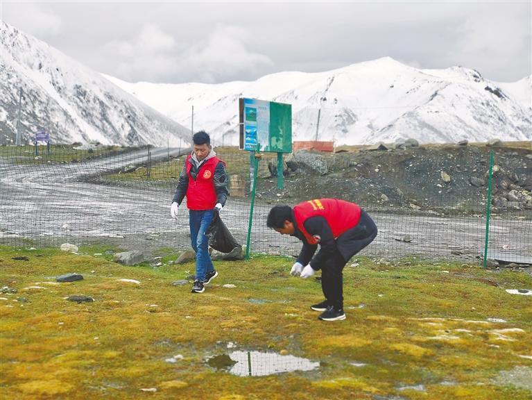 圖為該支部黨員在薩普雪山風(fēng)景區(qū)撿拾垃圾。記者 萬靖 攝