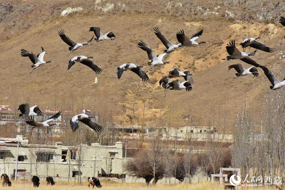 黑頸鶴在收割完的青稞地。人民網 李海霞 攝